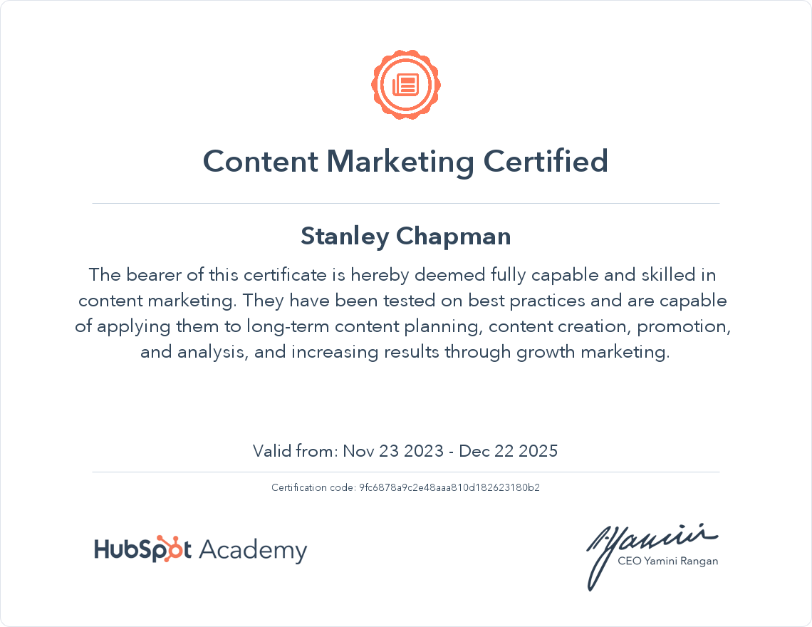 ← Back Published on 8th January 2025 Content Marketing Certification I completed the content marketing certification on Hubspot Academy.